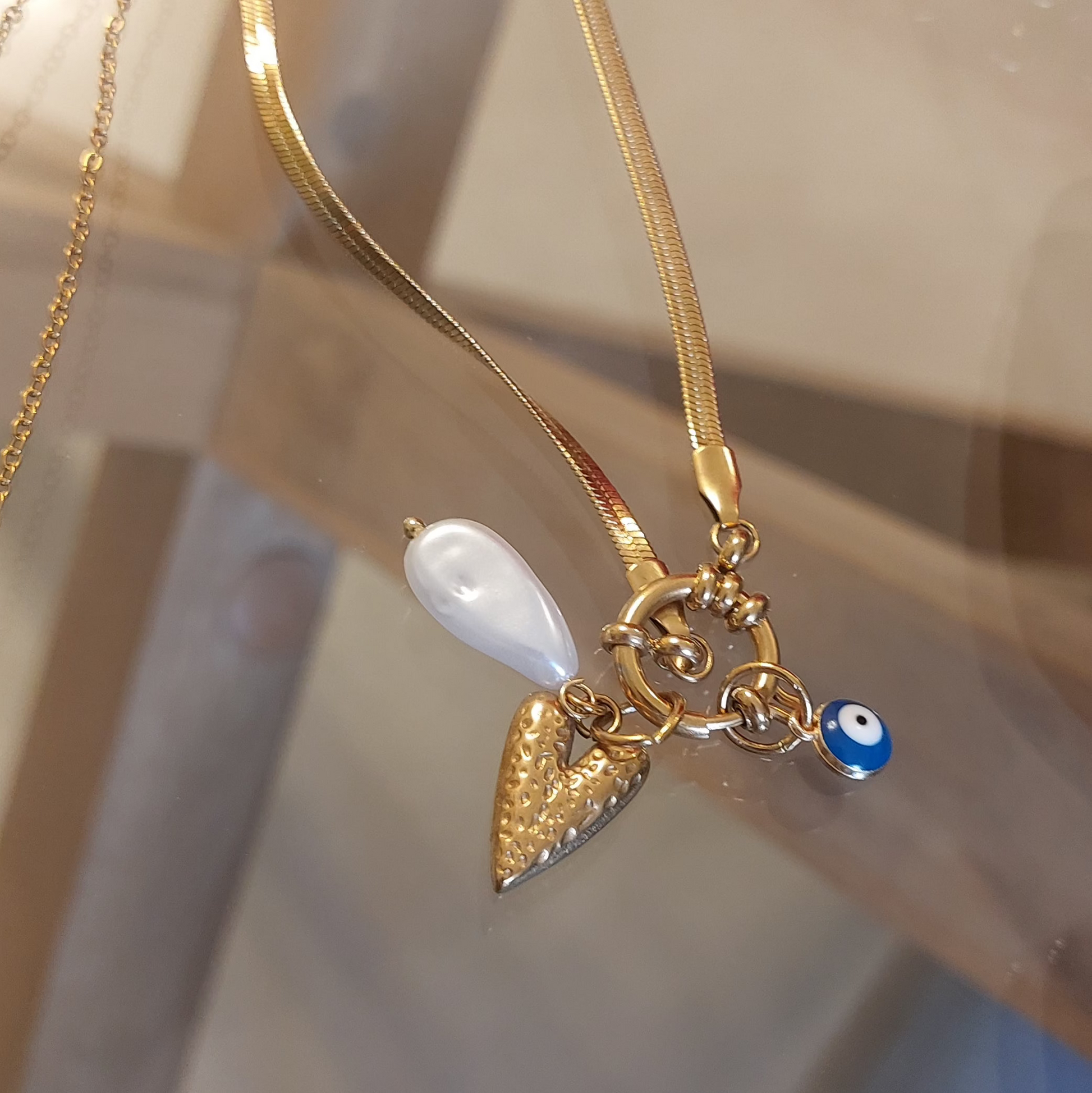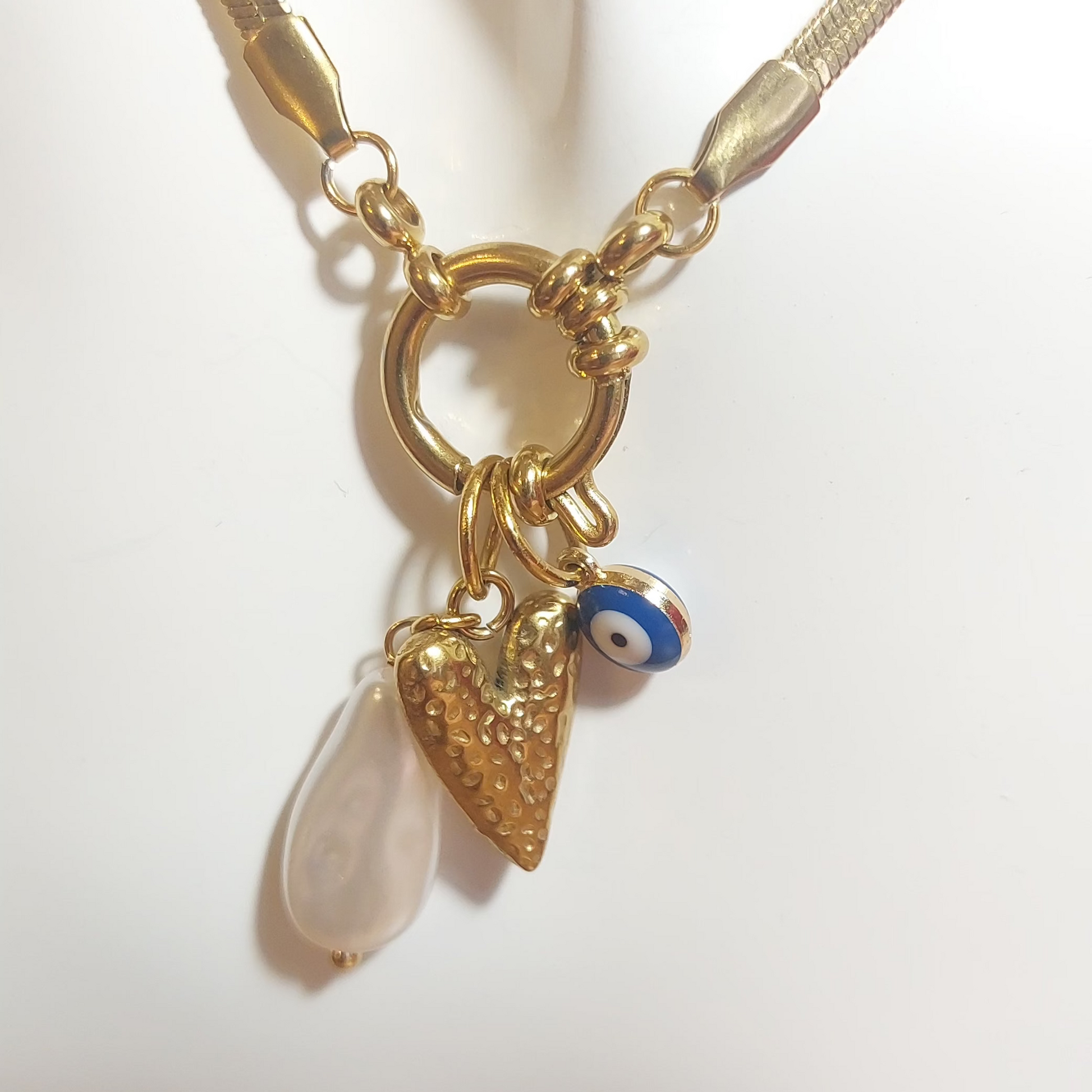 Το κρεμαστό είναι από ανοξείδωτο ατσάλι και περιλαμβάνει ματάκι (προστασία), καρδούλα (αγάπη) και πέρλα (κομψότητα και καθαρότητα).